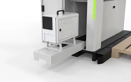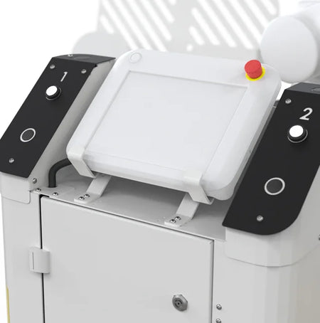 - Modulares Design: Das System verfügt über ein modulares Design mit einer Hauptkonsole, die die Robotersteuerung, Kabel und andere wichtige Komponenten in einem sicheren, übersichtlichen Innenfach beherbergt. Des Weiteren ist die Konsole mit einem integrierten Bedienfeld ausgestattet, welches für eine ergonomische Bedienung in einer Höhe von 1,4 Metern angebracht ist.